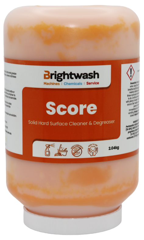 Score emulsifies grease and oil on food preparation and meat cutting surfaces, walls, floors or any hard surface. Rinses easily and leaves no residue or film